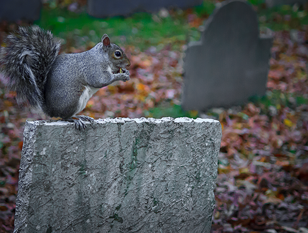 So now I make my way back to the ancient cemetery with my big, beautiful tree. Yes, I am a tree hugger; at least with that one I am! Oh, what a happy surprise! The squirrels are there gathering their acorns and playing. Oh, how I love taking photos of animals. And today, everything seems to be going good. I can’t even take a bad picture at the moment. It all “clicks” somehow. Even the tombstones seem to be joining in the fun! Here’s some of my shots of the squirrels, the tombstones and sunset in Salem. Sunset in Salem is absolutely a magical time. I’ve never seen anything like it! So I click and I click and I click and click! If I didn’t know better, I’d say those tombstones look like they’re posing as well! Here’s a few of the shots I got on this wonderful day with the stormy sky.