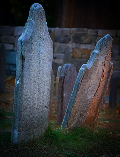 Oh my goodness, it appears to be getting dark now. I get a few photos of the Salem Witch Walk’s lighting falling on the tombstones. It is so hard tearing myself away at this point. Lord, the struggles I go through in this little town!