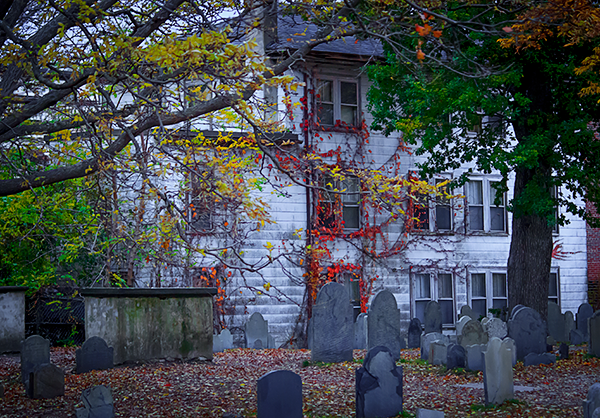 And there are the assorted buildings, the Witch Memorial, all being presented during the setting of the sun. Ah, the beautiful sunset in Salem settling so gracefully in the stormy sky here in a most ancient cemetery.