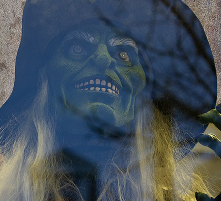 I decided to sleep a bit more and then go out which is exactly what I did. It was dark as pitch when I finally got outside and rather cold and raining. I took some very strange video out there in the Commons. In the video that I was taking, my shadow moved along very slowly from one side of a “Welcome to Salem” sign to the other side and disappeared. The shadow even turned around and took a couple of steps backwards along the way! I know that doesn’t sound like anything but I was standing still and literally filming my shadow moving away from me and disappearing on the other side of the sign! I didn’t see this event until I viewed the video on my computer. Well, I loved it, of course, so I quickly put some creepy music on it and uploaded it to my You Tube Channel. Yes, I have a You Tube Channel! And quite honestly, I’ve had several very strange experiences in Salem. I can truly say without a doubt that Salem is haunted. There are many spirits moving around these old Salem streets and I’ve been blessed to be aware of them. Mainly they appear in my photos but sometimes they are physical as well. There was one who appeared just as I was taking a photo of a store window. She was so small and seemed to have a little witch dress on, I kid you not! She came dashing around me so fast. I could actually hear her coming from behind me (it was late and dark with no one around). I could hear this clattering/clicking sound on the cobblestones and as she went around me, she upset the atmosphere. My camera picked this up and surprisingly you can see her in the bottom corner of my photo. She actually looked like a white stick figure (ectoplasm) in a full-run stance with just the suggestion of a witch dress. Of course, I didn’t see her until later when I downloaded the photo but I sure did hear her. She was making a real disturbance as she ran by me. I still remember it very clearly to this day. The other ghostly guy turned up by my side in the Charter Street cemetery. This was my first trip to Salem in 2009. It was my last day in Salem and I was getting in a few more photos before I had to leave. I was taking a photo of the tree that I love in the cemetery and, of course, I wasn’t aware of anything unusual but when I got home and looked at the photo, well, there he was! He was standing right there on my left side intently watching what I was doing. He was male and looked a bit misshappen but there he was, a dark shadow figure. I felt really honored that a spirit in Salem seemed to be so interested in what I was doing and I was so fortunate to catch him in my photo! Another photo I took in the same cemetery captured a swirl of orbs in front of the trees. It was quite beautiful. Another appeared to be a sunbeam playing among a display of Halloween flags hanging in front of a store on Derby Street. The way the sunbeam jumped from one flag to another seemed to not be possible with the sun’s movements and the order in which the photos were taken. It was quite strange. And certainly everyone has heard about the Hawthorne Hotel ghost. Well, I believe there may be something to that even though the Ghost Hunters didn’t find anything! During my first stay at the Hawthorne Hotel in 2009, I was all tucked in bed and sitting up watching TV when I felt something playing with my hair on the top of my head. I looked up and starting swatting things out of my hair thinking it was a spider. There was nothing there, and I looked everywhere! Also, when I stayed at the Hawthorne in 2010, I had several people ask me if I’d seen the ghost when they saw me on the 6th floor. I mean when I was looking out the window and there was a tour outside, they would holler up and ask if I had seen the ghost! I never experienced a ghost while I was in that room but the bed was a true nightmare!